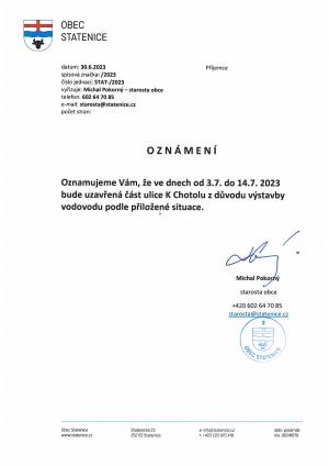 Ve čtvrtek 3.8.2023 od 9:00 do 12:00 hodin bude částečně neprůjezdná ulice k Chotolu z ulice Statenická z důvodu skládání stavebního materiálu. Do ulic Akátová, Topolová a Březová se dostanete přes ulici Keltská.