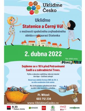 Letos po dlouhé době proběhne 2. dubna akce UKLIĎME ČESKO. Všichni dobrovolníci jsou více než vítáni. Další užitečné informace najdete na facebookové stránce Ukliďme Statenice a Černý Vůl nebo kontaktujte Pavlu Witzel, organizátorku akce.