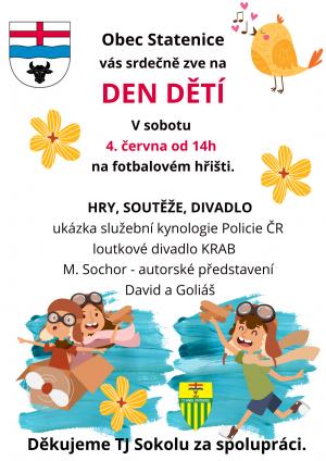 Obec Statenice pořádá 4.6. od 14:00h na fotbalovém hřišti DEN DĚTÍ.