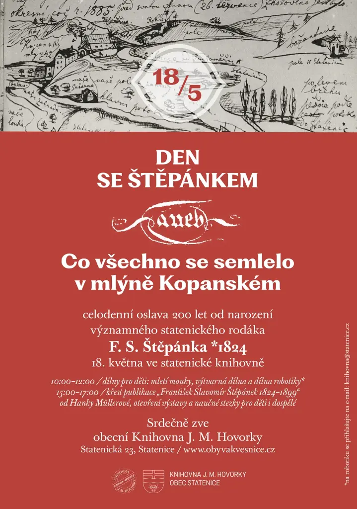 V rámci oslavy 200 let od narození F. S. Štěpánka z Kopanského mlýna si děti budou moci vyzkoušet mlít mouku a upéct z ní placky, vyzkoušet si robotiku a rozpohybovat mlýnek ze stavebnice Lego nebo si zkusit kreslit perem jako za časů Štěpánka.