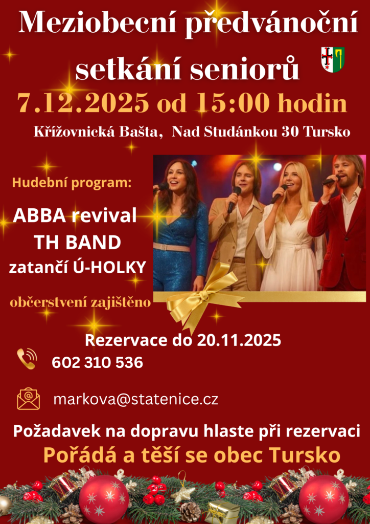 Obec Tursko srdečně zve všechny seniory na meziobecní předvánoční setkání, které se uskuteční 7. prosince 2025 od 15:00 hodin v Křížovnické Baště, Nad Studánkou. Tato akce je skvělou příležitostí k setkání a společenskému vyžití. V případě, že se akce zúčastní větší počet občanů z obce Statenice, bude zajištěna doprava. V případě zájmu se hlaste paní Markové (602 310 536, markova@statenice.cz).