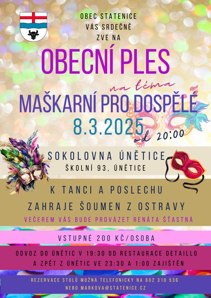 Všichni jste srdečně zváni na maškarní obecní ples, který pořádáme 8.3.2025 v sokolovně v Úněticích.