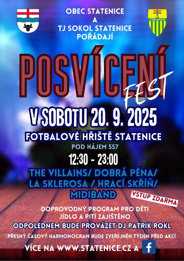 Obec Statenice a TJ Sokol Statenice společnými silami pořádají již třetí POSVÍCENÍ-FEST. Zveme vás na hudební festival, který se koná 20. září na fotbalovém hřišti TJ Sokola Statenice. Přijďte si užít skvělou atmosféru s kapelami jako THE VILLAINS, DOBRÁ PĚNA, LA SKLEROSA, HRACI SKRIN A MIDIBAND. Doprovodný program pro děti. VSTUP ZDARMA.