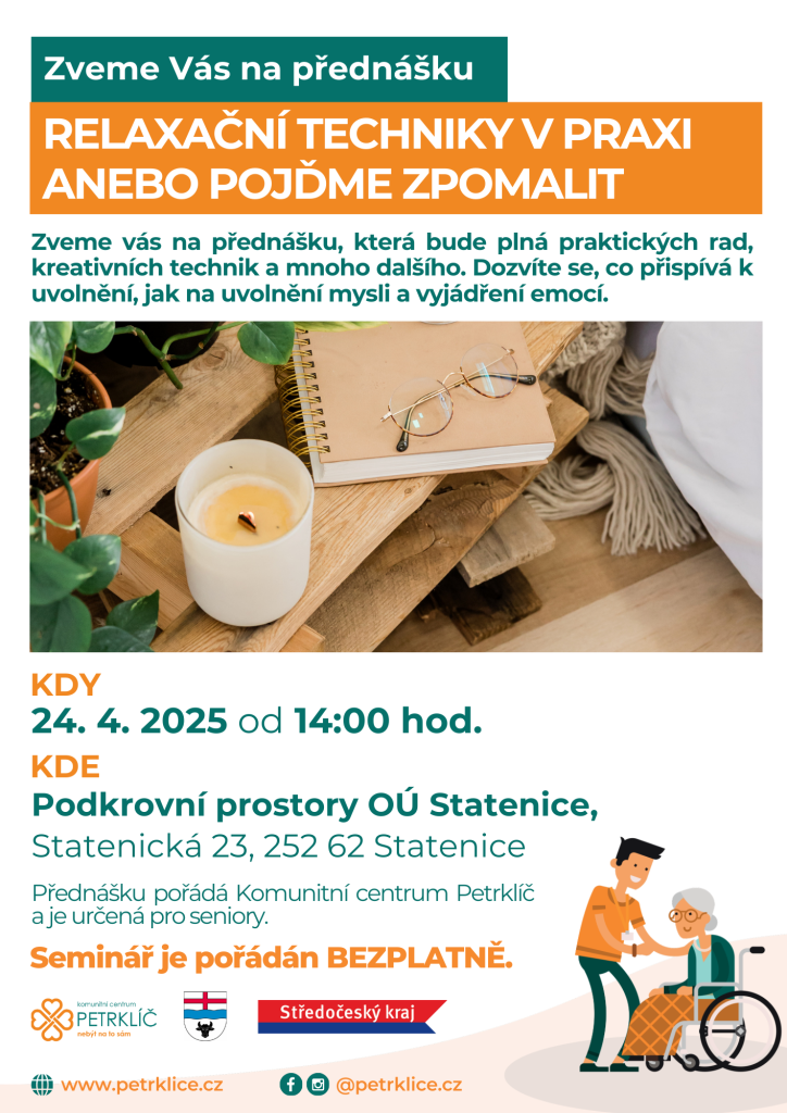 Komunitní centrum Petrklíč pořádá přednášku určenou pro seniory, která se uskuteční dnes 24. dubna 2025 od 14:00 hodin. V rámci této akce se účastníci dozvědí řadu praktických rad a kreativních technik, které napomáhají uvolnění a vyjádření emocí. Těšíme se na vaši účast v podkrovních prostorách OÚ Statenice.