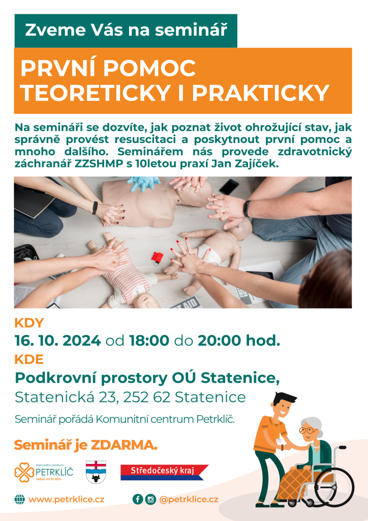 Komunitní centrum Petrklíč pořádá dne 16.10.2024 od 18:00 - 20:00 seminář o první pomoci. Budeme rádi, když se účastníte.