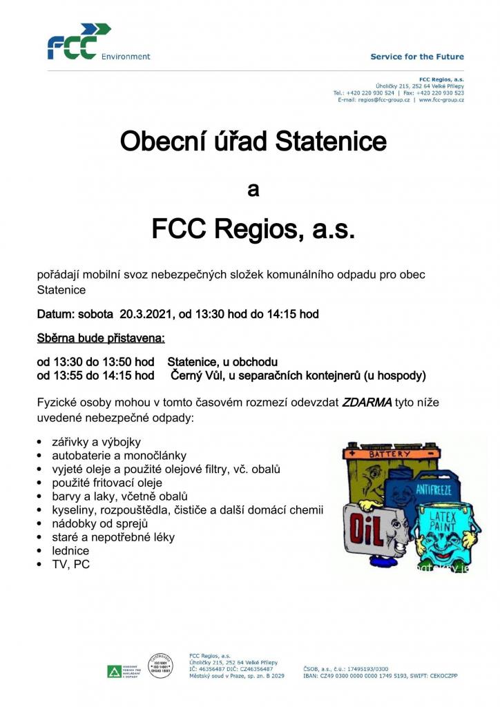 Obecní úřad Statenice a FCC Regios, a.s. pořádají mobilní svoz nebezpečných složek komunálního odpadu.