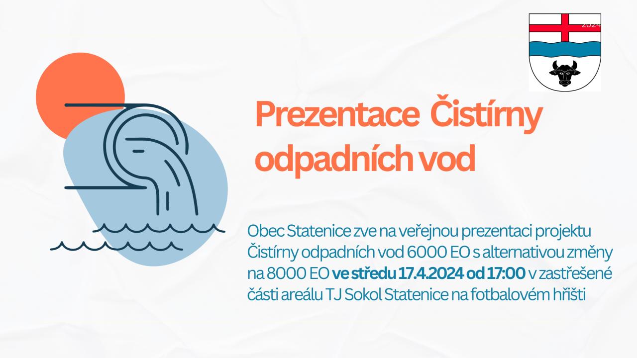 Obec Statenice zve na veřejnou prezentaci projektu Čistírny odpadních vod 6000 EO s alternativou změny na 8000 EO ve středu 17.4.2024 od 17:00 v zastřešené části areálu TJ Sokol Statenice na fotbalovém hřišti.