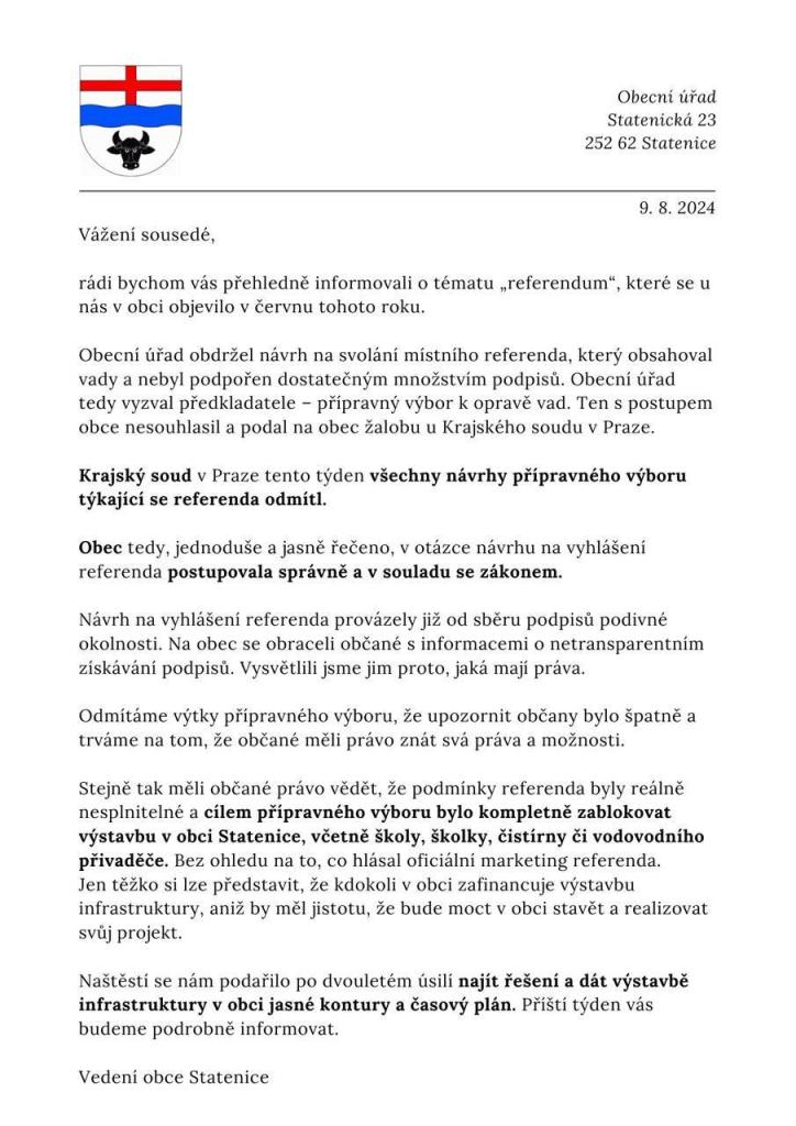 Vyjádření vedení obce Statenice k návrhu na konání místního referenda