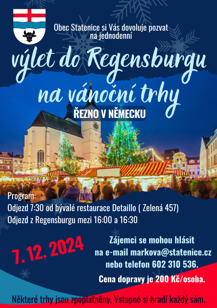 Obec Statenice pořádá letos výlet na vánoční trhy do Regensburgu. Jede se v sobotu 7.12. a zbývá posledních 20 míst. Zájemci se mohou hlásit na obecním úřadě nebo přes paní Gabrielu Markovou tel: 602 310 536; email: markova@statenice.cz