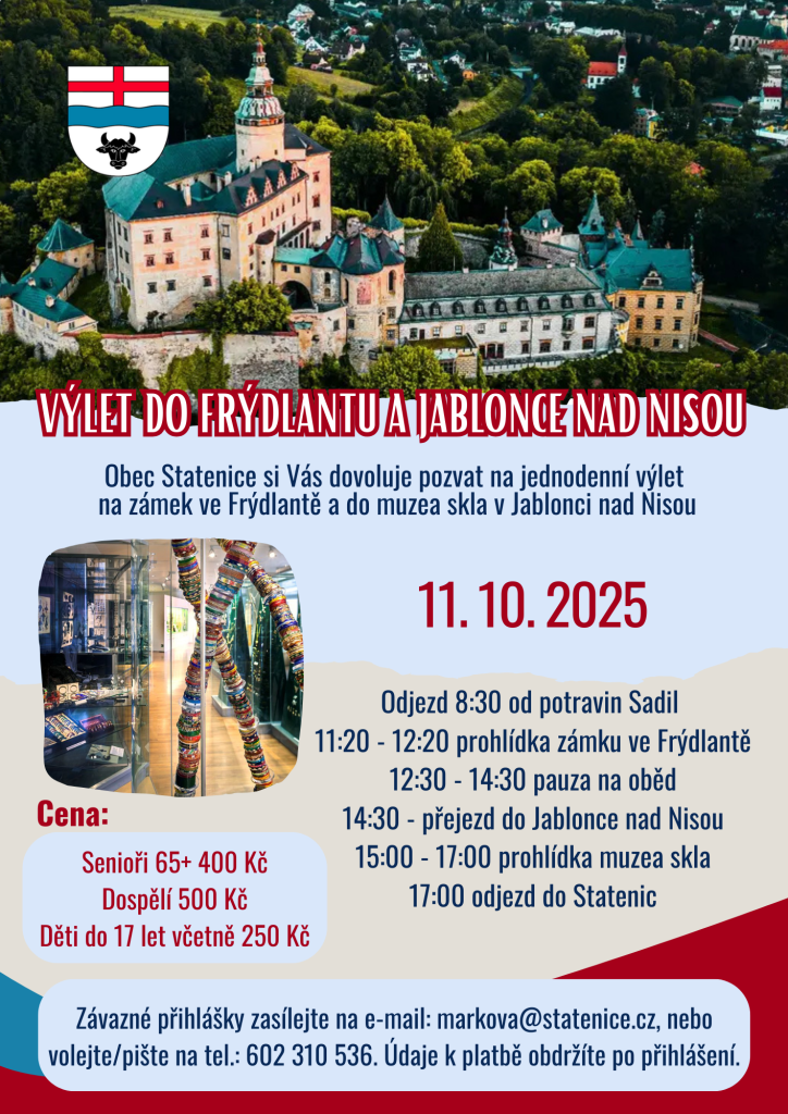 Obec Statenice pořádá jednodenní výlet na zámek ve Frýdlantě a do muzea skla v Jablonci nad Nisou. Odjezd je naplánován na 8:30 od potravin Sadil. Následuje prohlídka zámku, po které bude pauza na oběd. Po obědě se vydáme do Jablonce nad Nisou na prohlídku muzea skla, která potrvá do 17:00, kdy se vrátíme zpět do Statenic. Závazné přihlášky je třeba zaslat na email markova@statenice.cz nebo kontaktovat telefonicky.