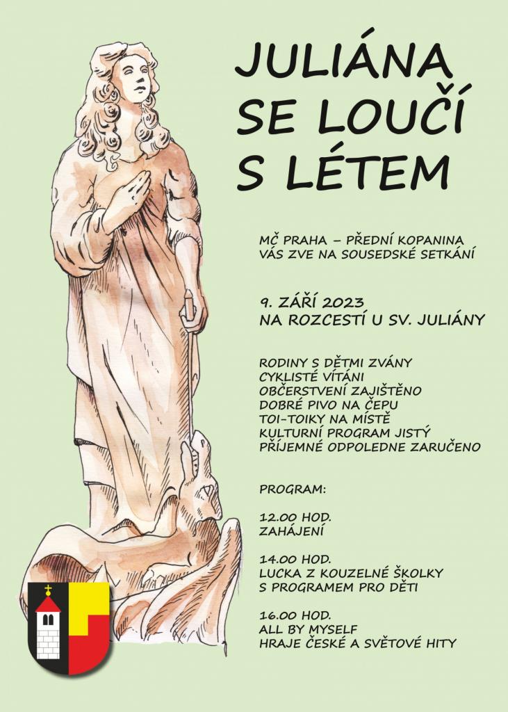 Všichni jste srdečně zváni na akci městské části Přední Kopaniny v sobotu 9.9.2023 od 12.00 hodin na rozcestí u sochy Sv. Juliány.